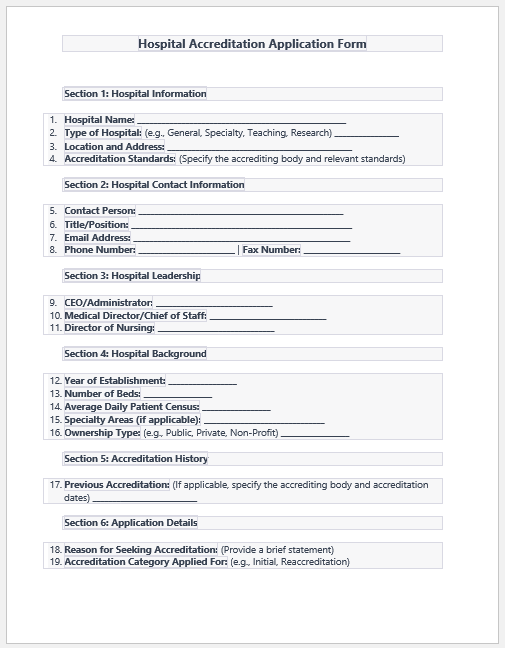 Whether you are going to fill this form or you want to create a form for other hospitals to fill it and put forward their request to get accredited, adding the following details will be helpful for you:
