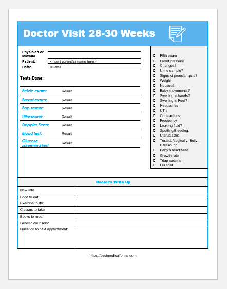 The doctor visit form in the third trimester is similar to that in week 20, with slight changes. The diagnosis is already established, and we are mainly concerned with the follow-up and tracking of the problem (if identified).