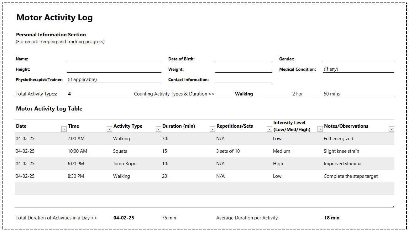- The upper extremity motor activity log begins with the identity of the patient and is never missed because this is a serious mistake. The patient’s name, age, and type of surgery performed are important to mention. The name of the surgeon is also mentioned.